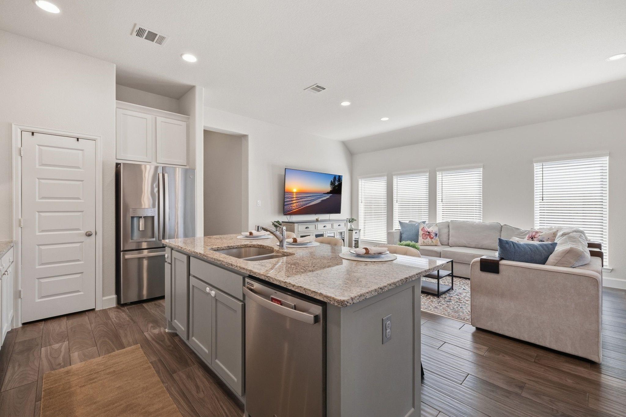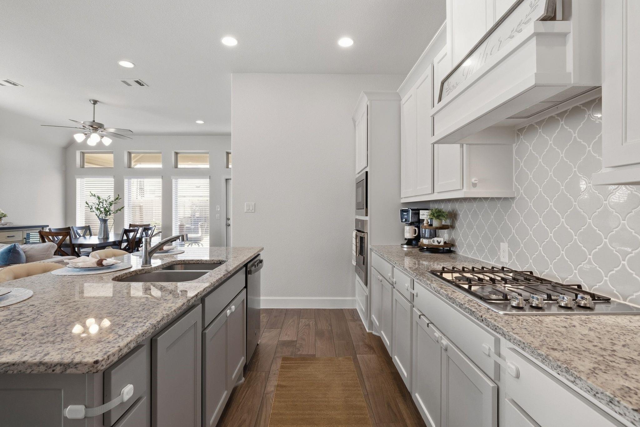 Experience the charm of this exceptional home, even better than new construction. The extended entry with a soaring 12-foot ceiling leads into an open-concept kitchen, dining, and family room with 10-foot ceilings and abundant natural light. The kitchen features a walk-in pantry, generous counter space, and a large island with seating.