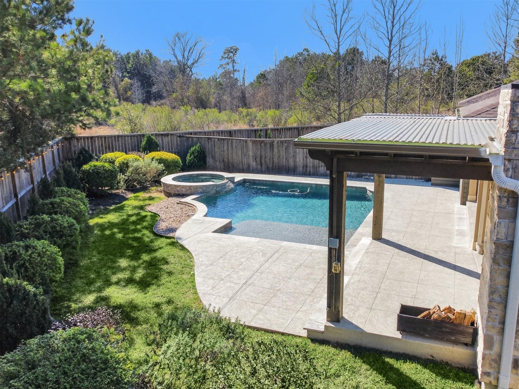 This townhome has the backyard everyone dreams about. Tucked away on a rare oversized lot in The Woodlands, it features a custom pool and spa, cedar pergola, outdoor fireplace, and a pool chiller to beat the Texas heat.
